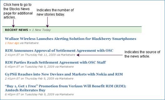 The Recent News section displays the headlines of recent articles related to the selected security. If you mouse over the headline, the first few sentences from the article are displayed. Click the headline to display the article.