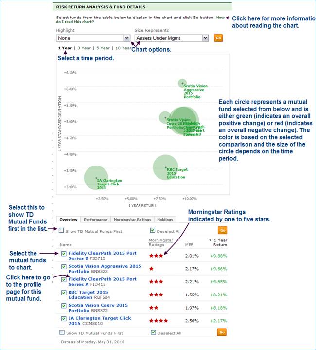 Size Represents box: The circles represent an attribute of the fund. By default, the circles show the relative size of the Assets Under Management. You can also have the circle size represent relative Management Expense Ratio (MER), Morningstar Rating, and others.
